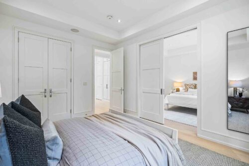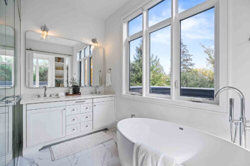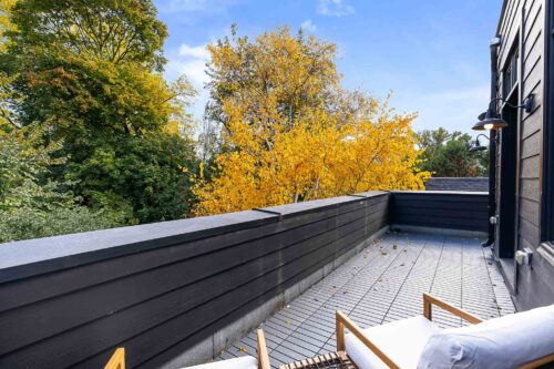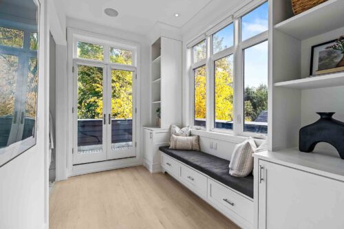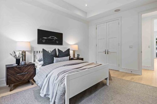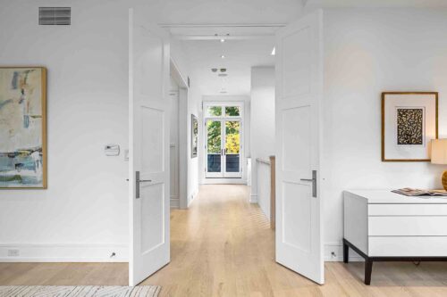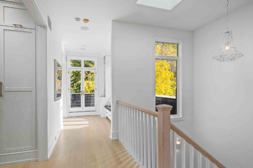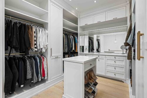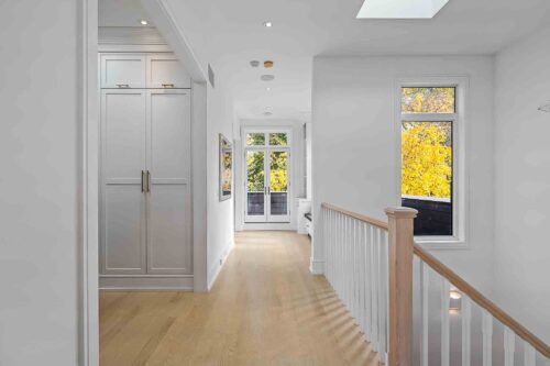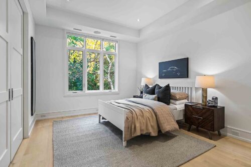 The third floor is dedicated entirely to the primary suite, and it is quite a retreat to enjoy. French doors open to the king-sized bedroom with a tandem seating area and a walk-out to one of two terraces on this floor. The walk-in dressing room is perfectly lined with carefully planned storage for each parent, with drawers, long hanging, short hanging and ample cupboard space. Carrying past this, more custom millwork and storage line the south wall before arriving at the gorgeous ensuite bathroom, outfitted with a huge walk-in shower, double vanity and deep soaking tub. Walk out to the second terrace with the most incredible treetop views, and relax amongst the canopy of birch and maple leaves fluttering in the wind.
