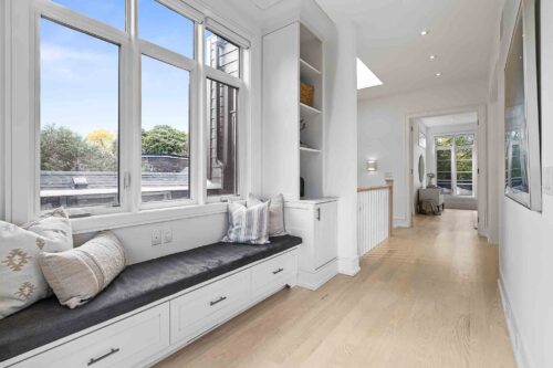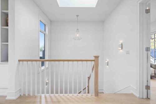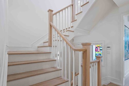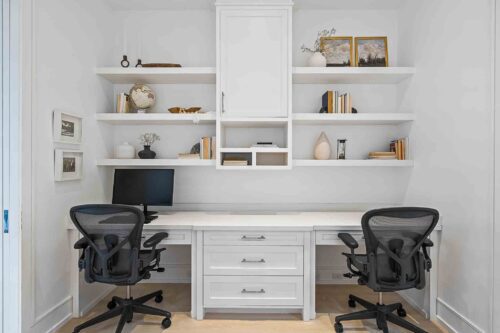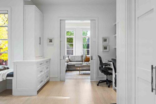 The footprint and design of the second floor were so thoughtfully planned. It holds three huge bedrooms, a built-in home office, and two large renovated bathrooms. The front bedroom is currently used as a second-floor family room and holds a four-piece ensuite bathroom. Children can bond more easily with connecting bedrooms, and each is outfitted with large walk-in closets. The second-floor office or homework area provides for two workstations, and a tandem window bench is framed under windows that face both south and west.