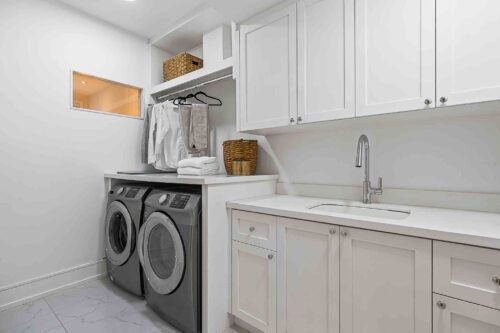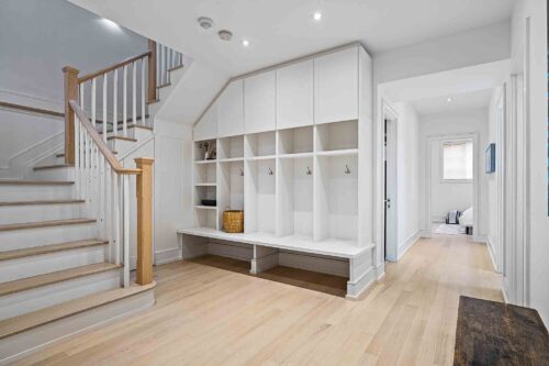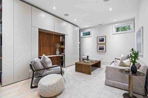 The home is serviced by a very rare private driveway with parking for up to two cars. A side room entrance from the private driveway connects quickly to the mud room that lies at the base of the stairs, with built-in cubbies for all family members. The recreation room expands to the full width of the home, allowing for multiple zones of entertainment and with a direct walk-out to the garden. An in-law or guest suite is set at the front of the basement and has access to a beautifully appointed four-piece bathroom with a custom oak wall feature and a large steam shower. The laundry room holds full-sized machines, a stainless steel soaking sink and built-in cabinets for extra storage. Storage opportunities continue in the two huge closets on this floor, as well as the two cavities underneath the staircase. Outside the walk-out from the basement is a massive storage room underneath the covered porch above, serving as a concealed storage room for outdoor furniture, landscaping items, winter tires and seasonal items.