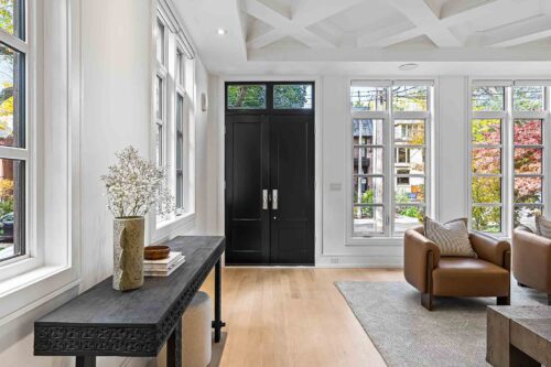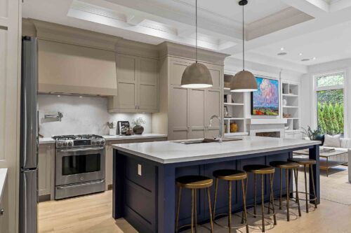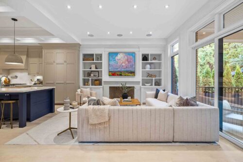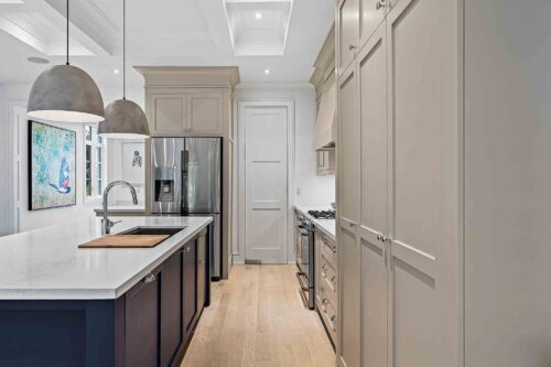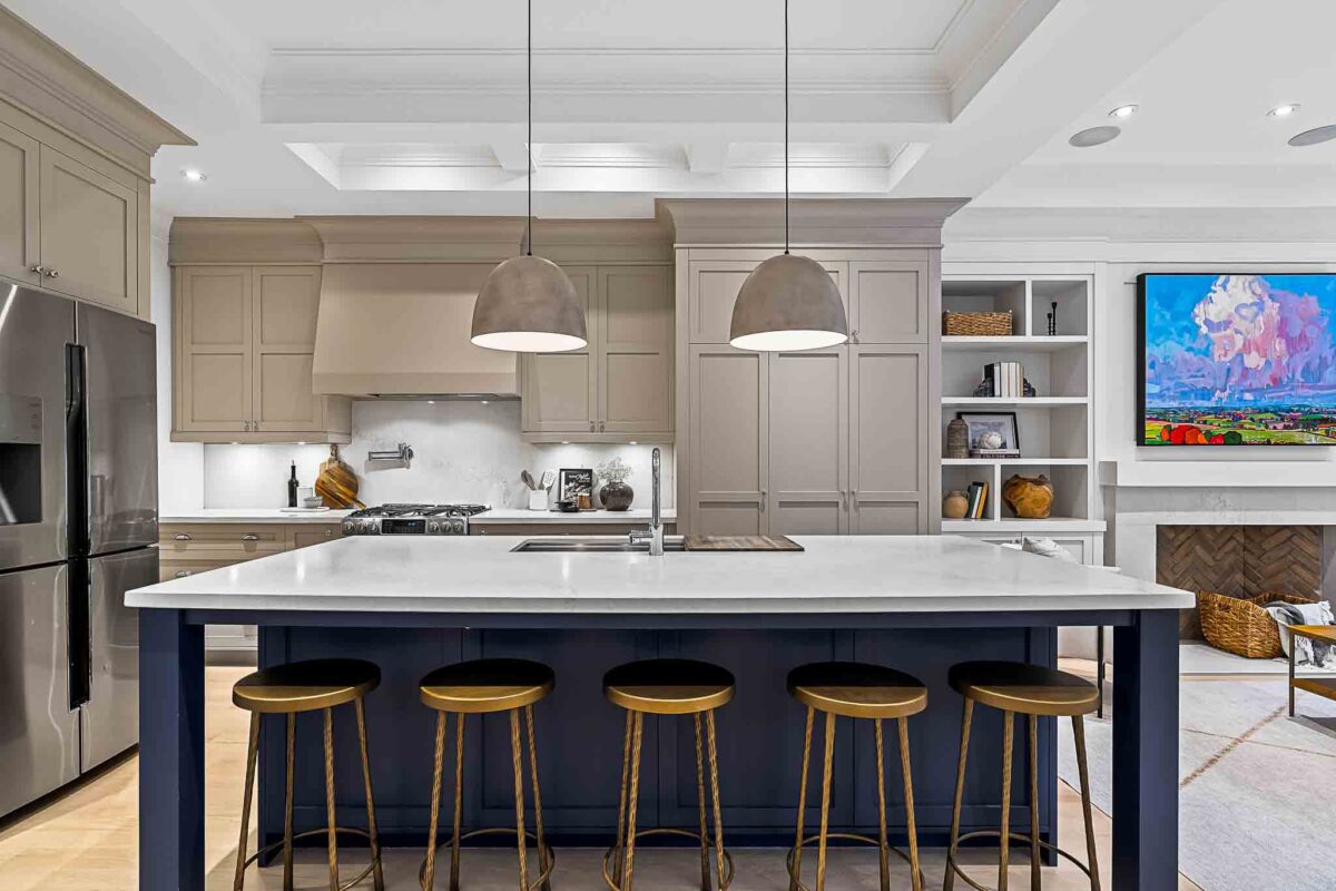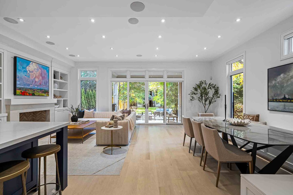 Within its walls, ceiling heights reach ten feet on the main floor, and the interior spaces impress with every corner you turn. Light plays an important role within the home, with oversized windows pouring natural light onto each level. The living room is beautifully appointed with coffered ceilings and impressive proportions. Pass by the discreetly positioned powder room with its lightbox art installation to reach the astounding open-concept interactive space where everyday lives are lived.