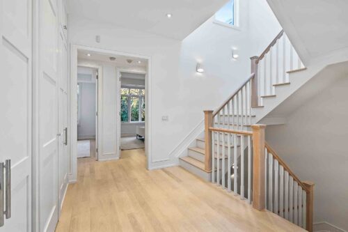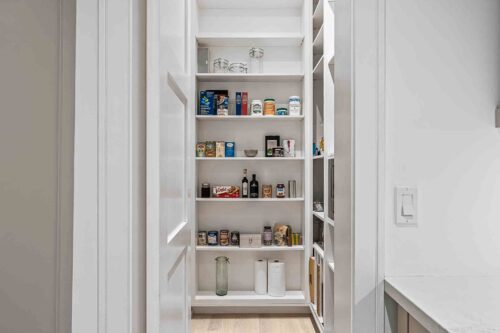 The kitchen holds two walls of customized solid wooden storage, stainless steel appliances and is anchored by a huge centre island with breakfast bar seating for the whole family. A concealed pantry is tucked away with room for a household of groceries. Storage is an ongoing theme in this house, as it was maximized during the design phase of its conception.