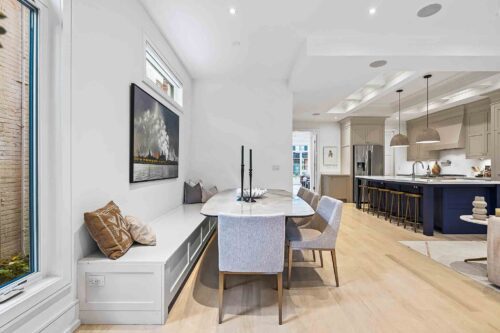 Beside the kitchen lies the main floor family room with an ornamental fireplace and flanking bookshelves and storage. A walk-out to the covered deck can be accessed from both the family room and the dining room, which is combined in this interactive space. A built-in bench with storage below makes the dining room more approachable to all ages, and the open-concept design continues the interactive nature of this home.