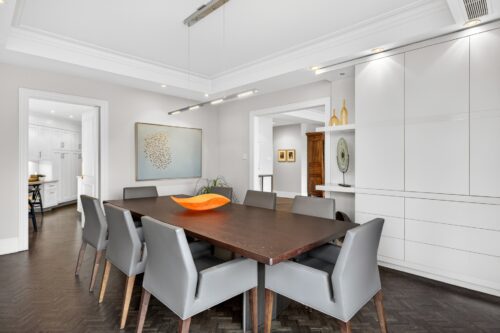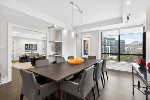 The living room is both expansive and inviting, filled with natural light and grounded by elegant symmetry that allows for effortless furnishing and an ideal backdrop for art. A large bay window frames tranquil views over a green parkette and the surrounding architecture. The dining room carries this same sense of proportion, designed to host with ease and enhanced by custom millwork that integrates storage with refinement.