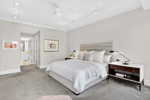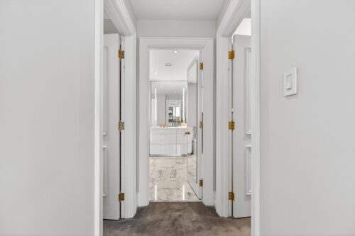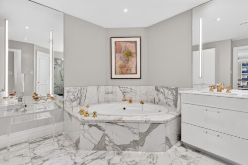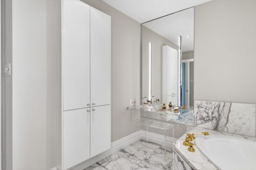 The primary suite is grand yet a lovely retreat, with custom millwork, automatic blinds, and generous space for furnishings. Two walk-in closets with tailored interiors lead to a six piece marble ensuite, beautifully finished in Calacatta marble with a double vanity, walk-in shower, water closet, and a deep soaking tub.