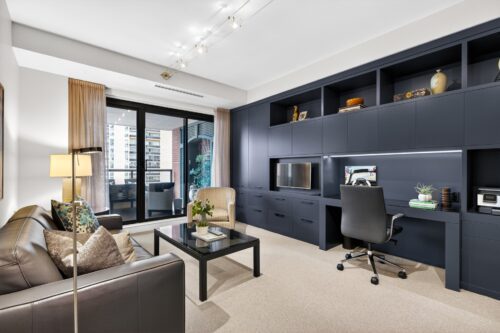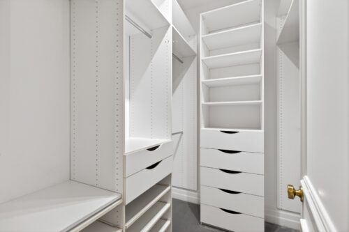On the opposite wing, the second bedroom has been thoughtfully designed with a full wall of custom millwork, incorporating additional storage, a built in workspace, and a discreet pull out bed. With its own ensuite, terrace access, and dual closets, it offers both comfort and independence for guests or family.