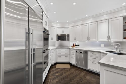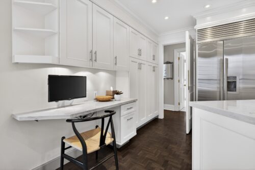 The kitchen is finished with timeless Calacatta stone and an exceptional abundance of cabinetry across three walls. A perfectly proportioned breakfast area overlooks the terrace and the treetops of David Balfour Park, bringing a quiet connection to nature into the everyday. Just beyond, a richly panelled den offers warmth and versatility. With custom built-ins and a southern exposure, it comfortably functions as both a refined sitting room and a fully realized work from home space.