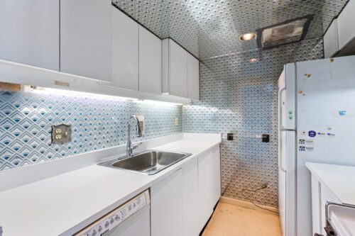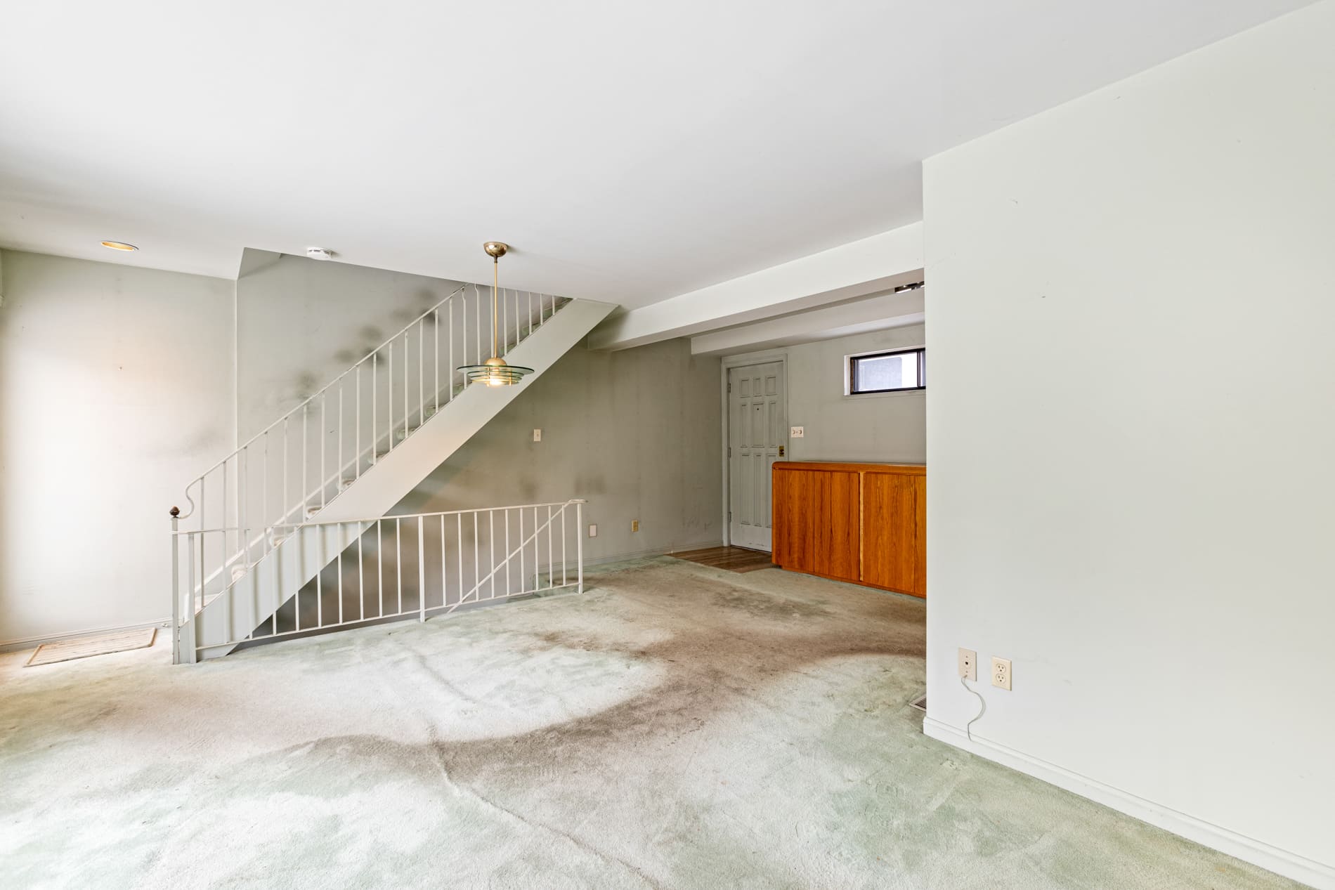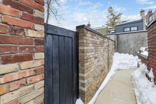 Accessed through a shared ivy-lined courtyard, the townhouse opens into an open-concept living and dining room anchored by a wood burning fireplace. The kitchen is a galley style, which could be opened in the future to connect more seamlessly to the principal spaces. Orientated to a westerly exposure, there is a main floor walk-out from the living room that opens to the private courtyard garden, framed by brick walls.