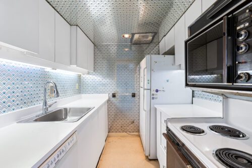 The second level currently features a generously sized bedroom, a four-piece bathroom, and several storage closets. Many neighbouring units have reconfigured this floor to accommodate two bedrooms, and floor plans are available of other examples of this, as required. On the third floor, the configuration also is currently designed as an open concept space, with a versatile future use to be directed by the next unit owner.