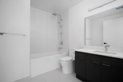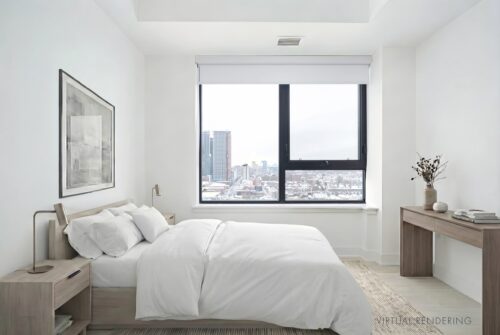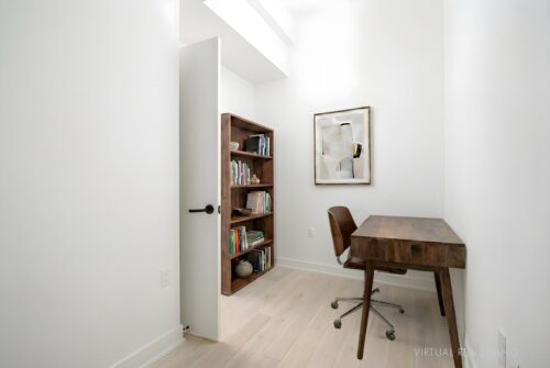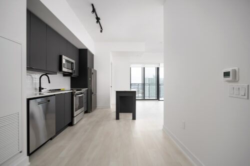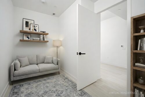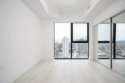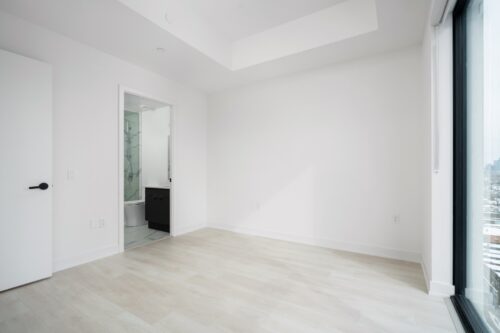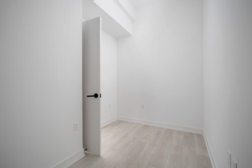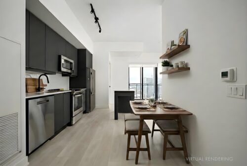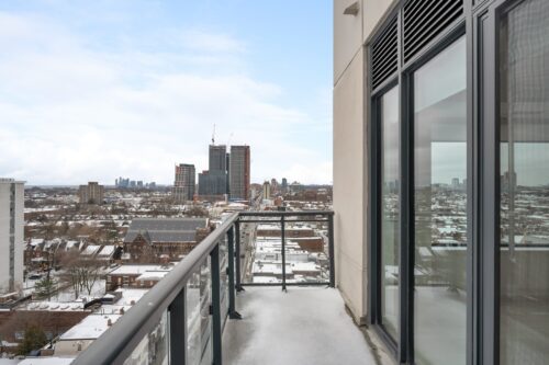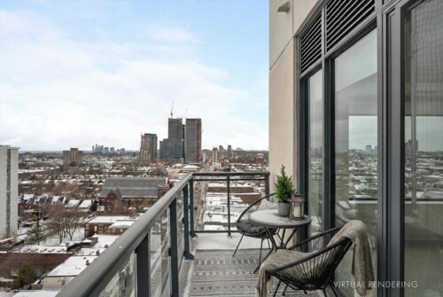 PH04 at Motto is a never lived in corner penthouse offering 982 square feet of intelligently planned interior space, 10 foot ceilings, and a private south west facing balcony with unobstructed skyline views stretching across Toronto’s west end to the downtown core. Positioned at the penthouse level with no overhead neighbours, the suite benefits from two exposures and consistent natural light throughout the day.