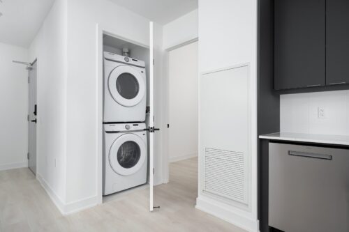 A true split bedroom layout positions the primary and second bedrooms at opposite ends of the floor plan, delivering meaningful privacy. The primary retreat includes a spa inspired ensuite, while the second bedroom benefits from its own city outlook. An enclosed den with a door functions as a legitimate third space, ideal for a dedicated home office or guest room. Samsung stacked laundry is discreetly tucked away, and premium underground parking and a locker are included.
